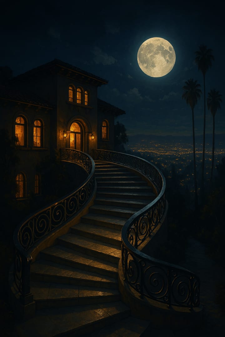 There was a house on a hill in the land of LA high upon the hill in the Hollywood Hills with a silver-railed and spiraled like a shell that remembered every whisper.