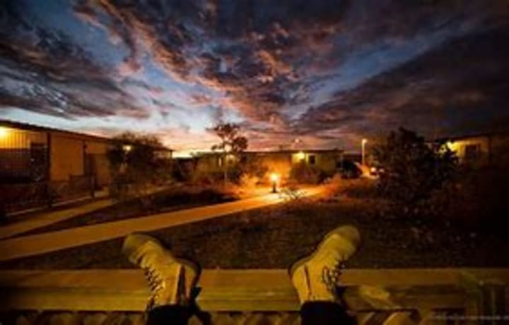 Thinking of home he sits at the table and looks around,