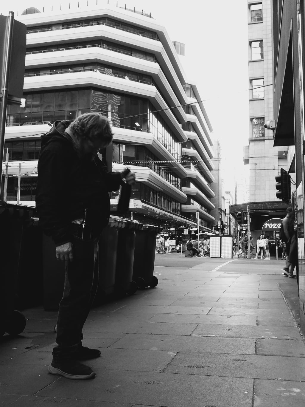 I see the man hunched over and crouched in the gutter, staring at the ground with his bag on his shoulder as if there is no world around him, although there is no life but us.