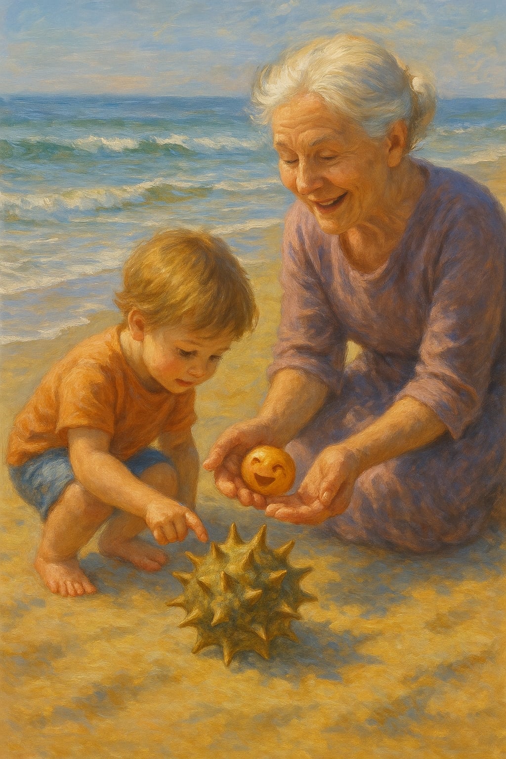 The porous surface of the shell of an unknown fruit, washed by the ocean, now rolls across the sand washed by the waves. Its spiky horns allow it to avoid being quickly caught and eaten, but as soon as it lands in a child's small fingers, the attempt to open it will begin. Grandma will open the hard-to-tear shell, and the fruit will fall out, smiling at everyone for a moment before being eaten.