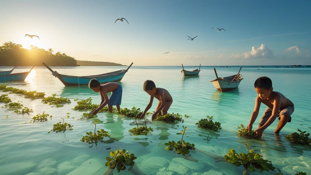 ![A serene coastal scene in Southeast Asia, where local fishers and children plant mangrove saplings along a shoreline, with a backdrop of restored coral reefs visible underwater. The golden light of dawn casts a hopeful glow, symbolizing renewal and community strength.]