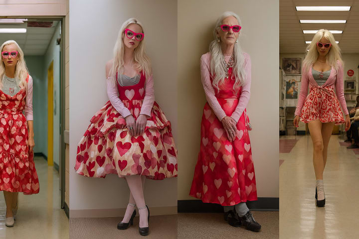 Red sundress with pink hearts, layered with a hot pink blouse and grey sports bra:
