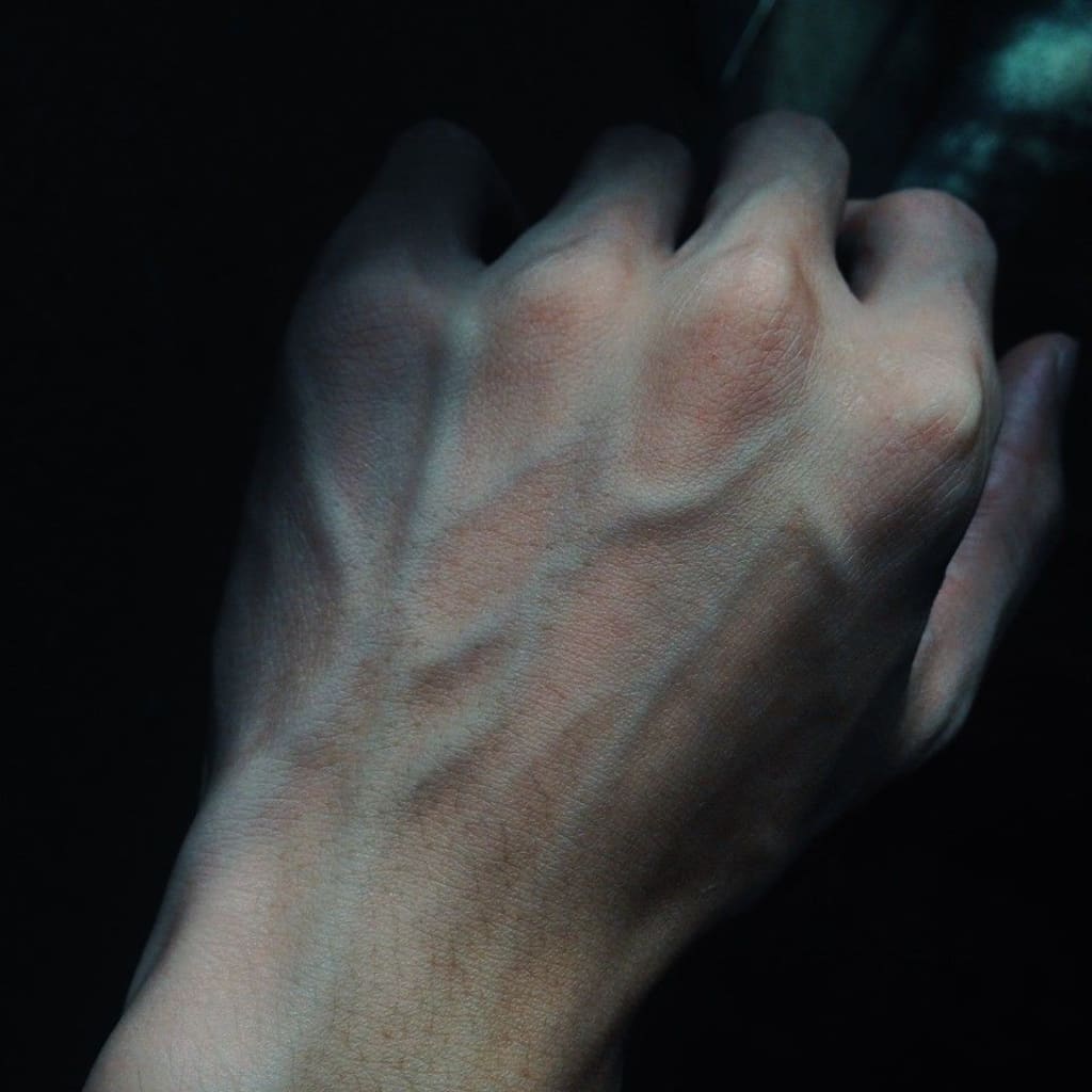 Blue veins stream his arm