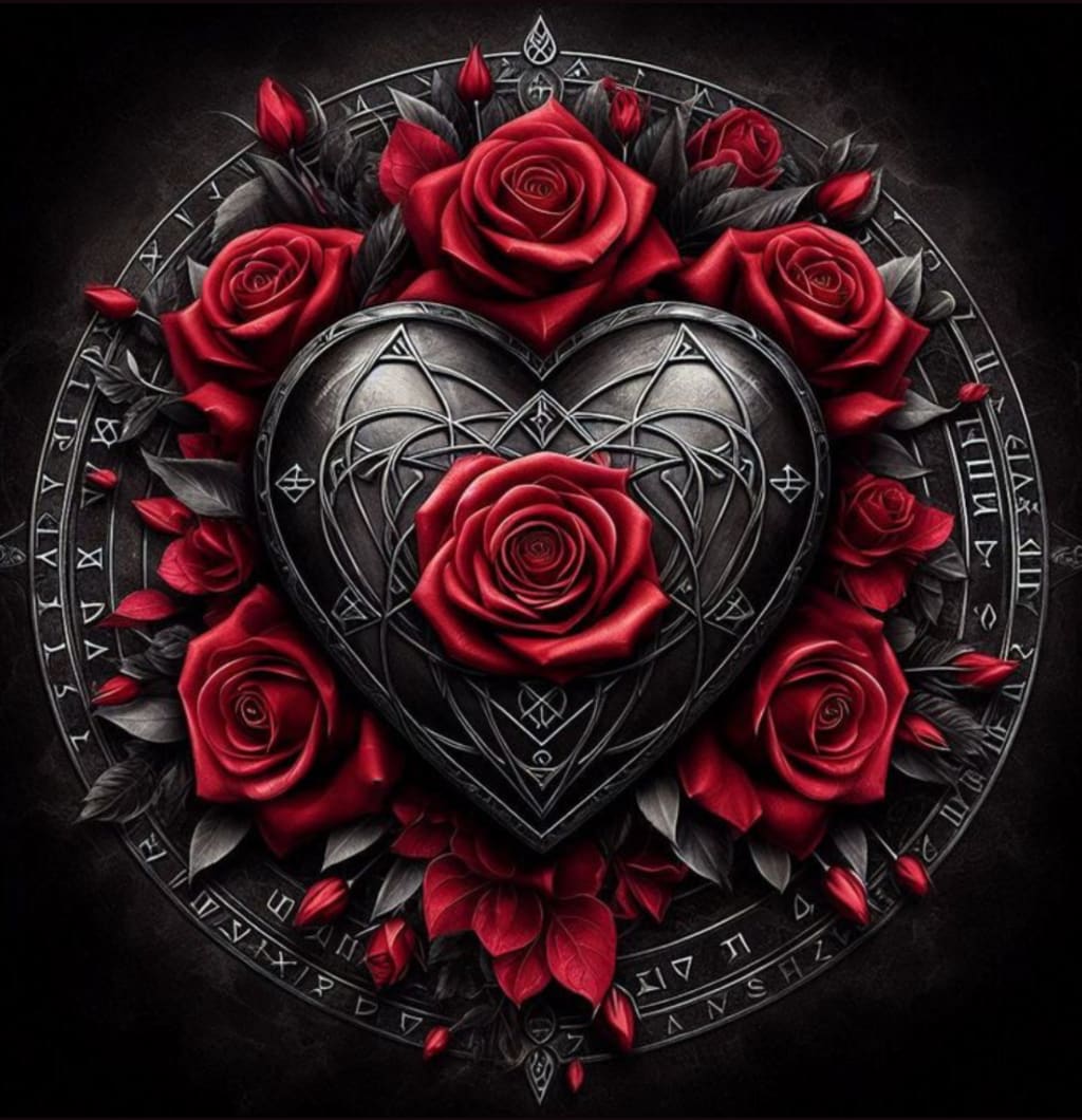 Roses and runes in a shadowy swell.