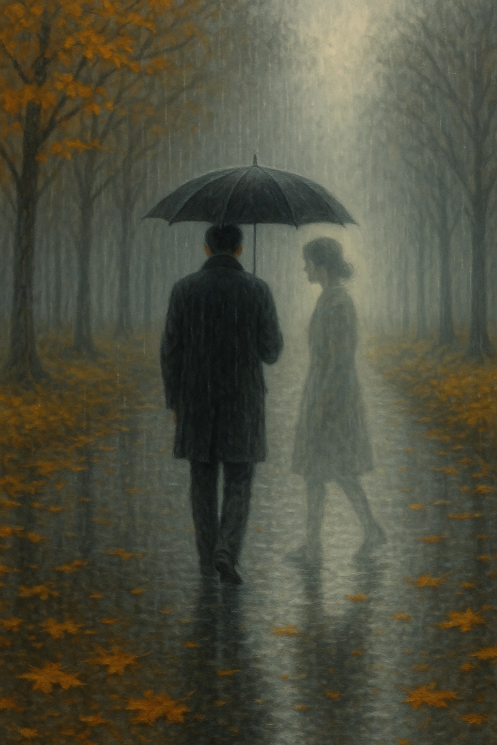 A solitary figure walks down a rainy, tree-lined path, holding a black umbrella. Autumn leaves scatter in the puddles. Faintly visible beside them is a soft, glowing silhouette of a loved one walking silently in step. The atmosphere is emotional, quiet, and nostalgic, with diffused light and mist surrounding them.