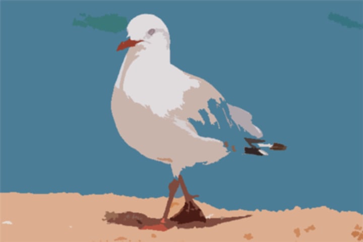 A solitary seagull stands bravely in the heavy wind whipping in off the bay, standing alone on park table, one legged, the other tucked in. A dark evening is rolling in on the clouds that are angrily threatening to come across the bay. The Seagull just wants a chip.