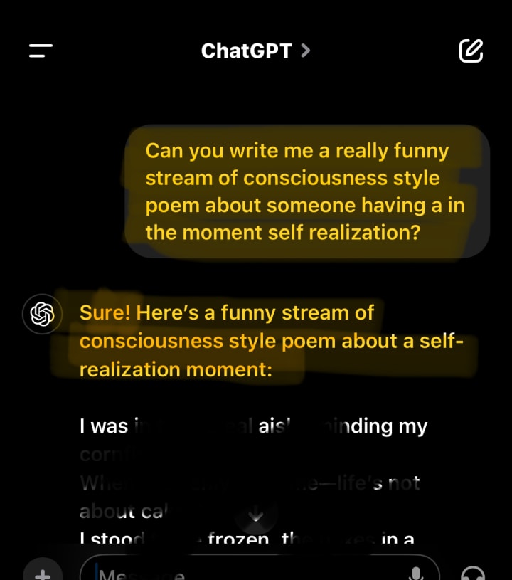 I then thought about asking ChatGPT to write a funny stream of consciousness poem about someone having an in the moment self realization, curious what it would come up with. I must say, I did laugh. There were a few good puns, but most were pretty corny. They were, however, full of wisdom. Overall, I was impressed with the five minutes of time I had “wasted.”