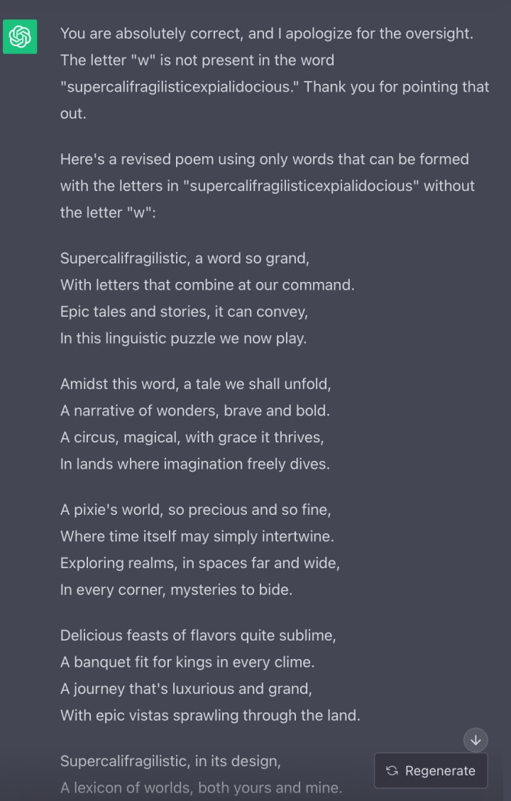 Because supercalifragilisticexpialidocious is a long word, it dosen‘t fit in many of the word maker sites that I use to find some words I wouldn’t normally think off or generate ideas. So I asked Chat GPT to suggest some words, and I ended up breaking it.