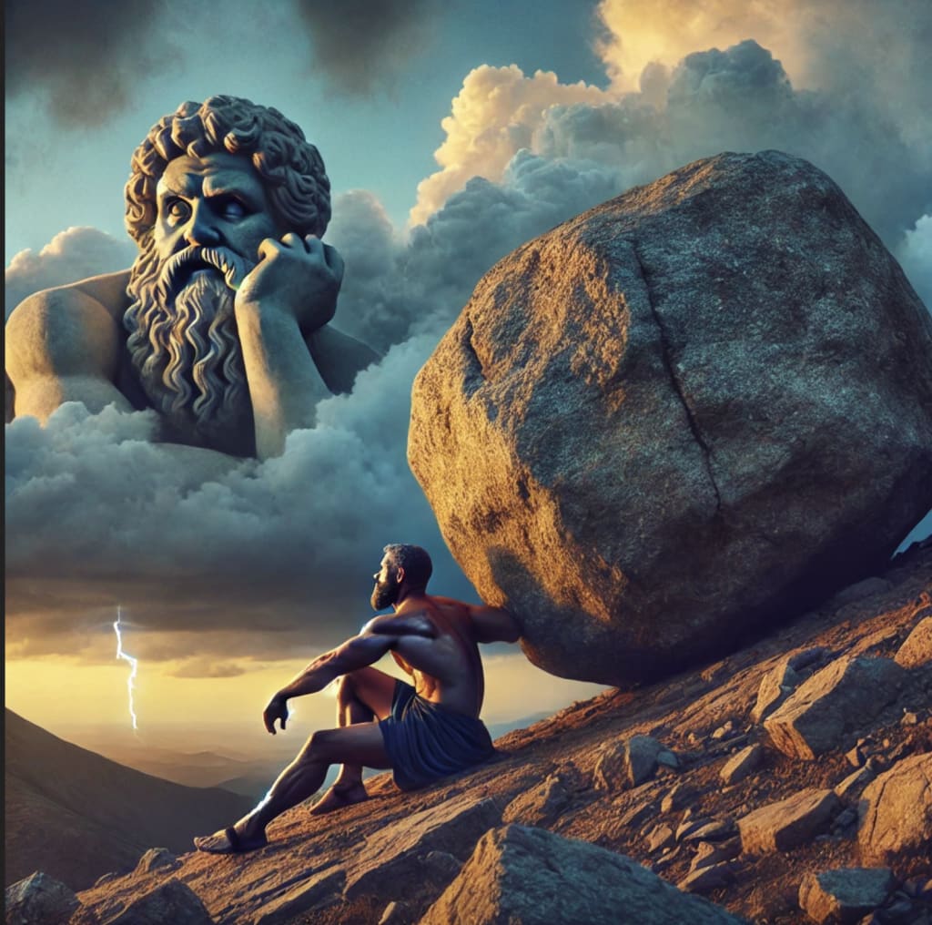 Image by DALL-E, best of 15 attempts to depict Sisyphus watching clouds