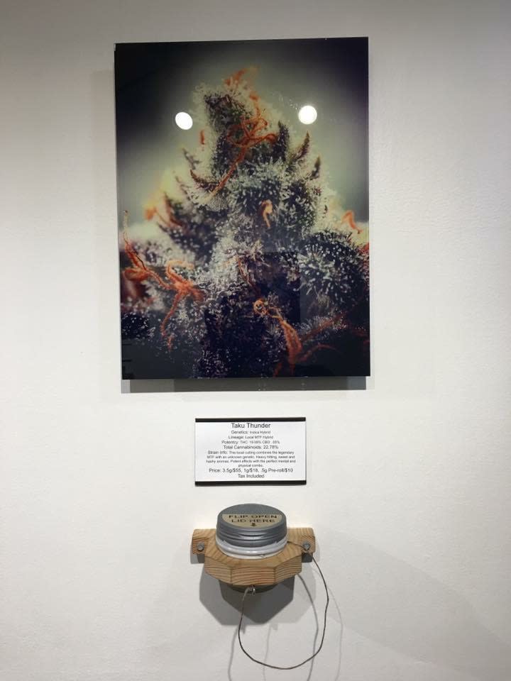 When I approached the door, a small window to my left opened and a beautiful man with a red beard asked politely for my ID. Upon age verification he opened the door for me. When I stepped through the door, there were three others in a space maybe 10 feet wide and 15 feet deep. It had white walls with beautifully framed single photos of the magnified colas of the product grown by The Fireweed Factory’s Standard Cultivation Facility that decorated the walls. Under the photo was the strain name and a detailed experience and terpene description. Below that was a shelf with a dish holding a sample for smell and sight purposes.