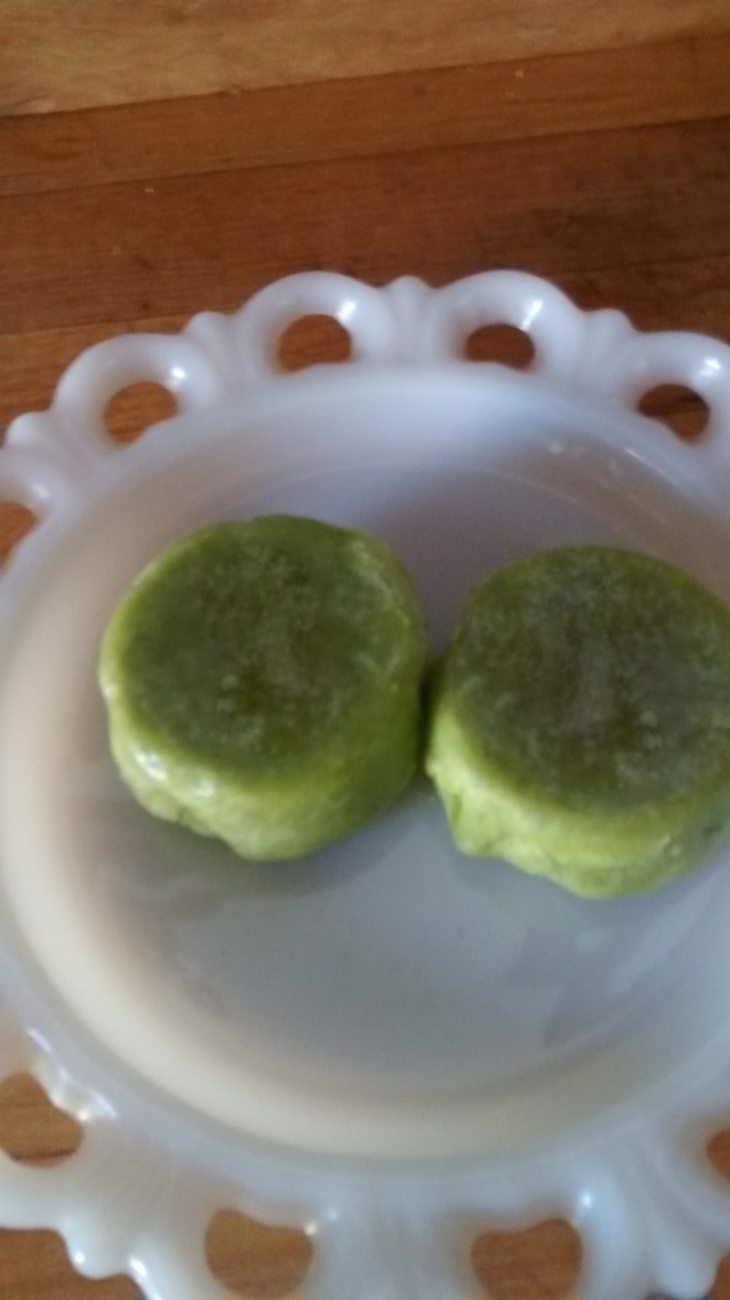 4) as the coconut oil begins to melt stir gently with a wooden spoon mixing both coconut oil and fine powder creating a beautiful green blend