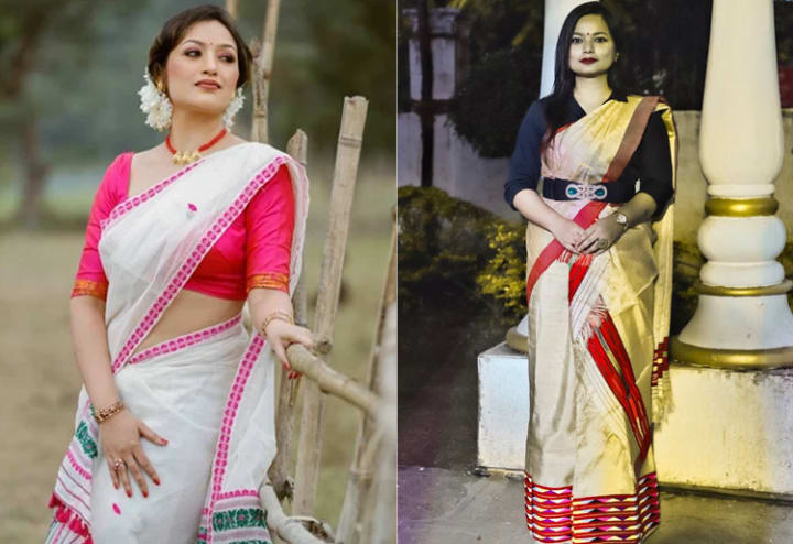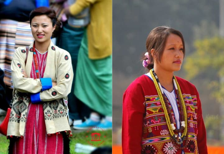 Moving to the beautiful northeast, we reach Arunachal Pradesh, from vibrant handwoven skirts to gorgeously embroidered jackets, Arunachali outfits are a reflection of the region’s local diversity and skilled craftsmanship. A full-sleeved coat over a loose chemise is the traditional wear for women. Here, bamboo and silver accessories are worn commonly. The men wear silk shirts and pin the edges around the shoulder to secure. Their customary green lungis have colored stripes of blue, yellow, or white. The Sherdukpen men’s wear is famous for the skull-caps called Gurdam, which are made from Yak hair.