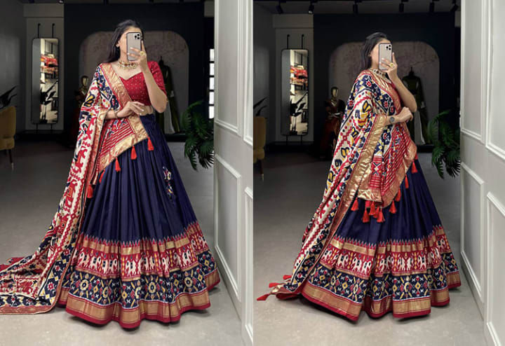 And here we come to swirl and twirl in the land of Gujarat! The Chaniya Choli, famous with its mirror work and rich vibrant colours, is the epitome of Indian festive fashion. From Navratri celebrations to functions and wedding, this outfit guarantees you to be the life of the party. In general, men wear a dhoti and a kurta.