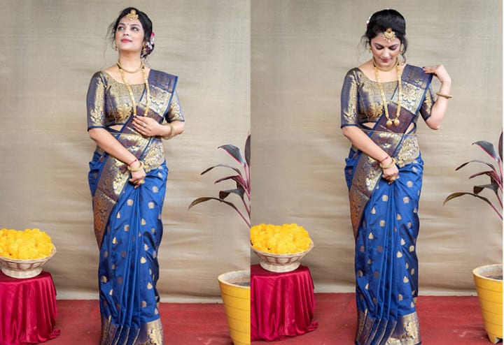 In the soil of Bollywood dreams, Maharashtra showcases the show-stopping Paithani Sarees. These sarees are a kaleidoscope of colours, reciting stories of tradition and style in each thread. The men wear a cotton kurta paired with the dhoti. Their cotton caps are called ‘pheta’ or ‘pagadi’. A sleeveless jacket called ‘bandi’ is often worn.