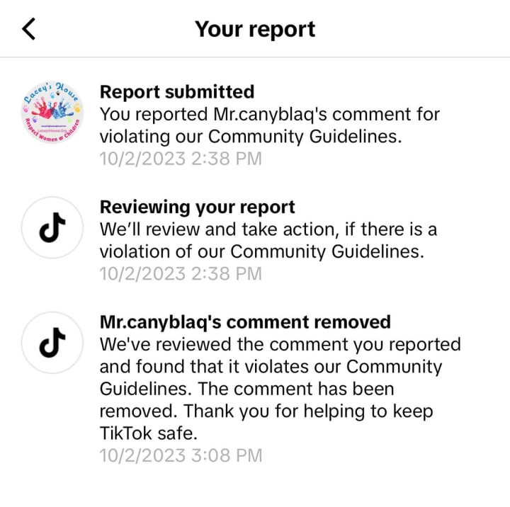 The comment where he threatened to kill someone stayed on TikTok for 2 days. I reported the comment, this is how long it took to remove the comment. They finally removed it after I reported his account, who knows how many others reported the comment.