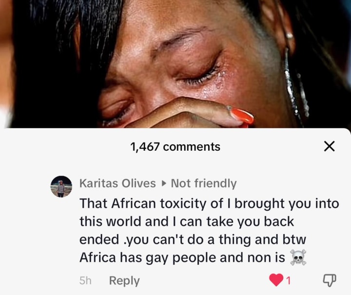 He identified himself as a Cameroonian and said that we'd kill you people there. When another account showed him the toxic, violence in his comment (other Africans) he then issued more threats. Which are now removed from TikTok.