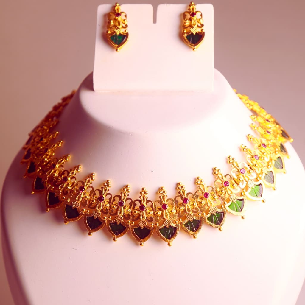 Palakka Mala: Featuring green stones set in gold, this necklace is a perfect blend of simplicity and opulence, making it ideal for the festive season.