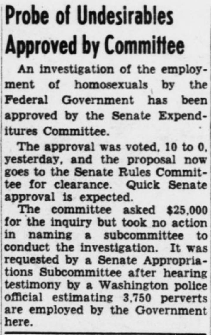 And because misery loves company, alongside the Red Scare came the Lavender Scare: a campaign to root out queer people from federal jobs. Labelled "security risks," gay men and lesbians were cast as ticking time bombs, supposedly ripe for blackmail. In 1953, President Eisenhower sealed their fate with Executive Order 10450, banning anyone deemed a "sexual pervert" from federal employment.