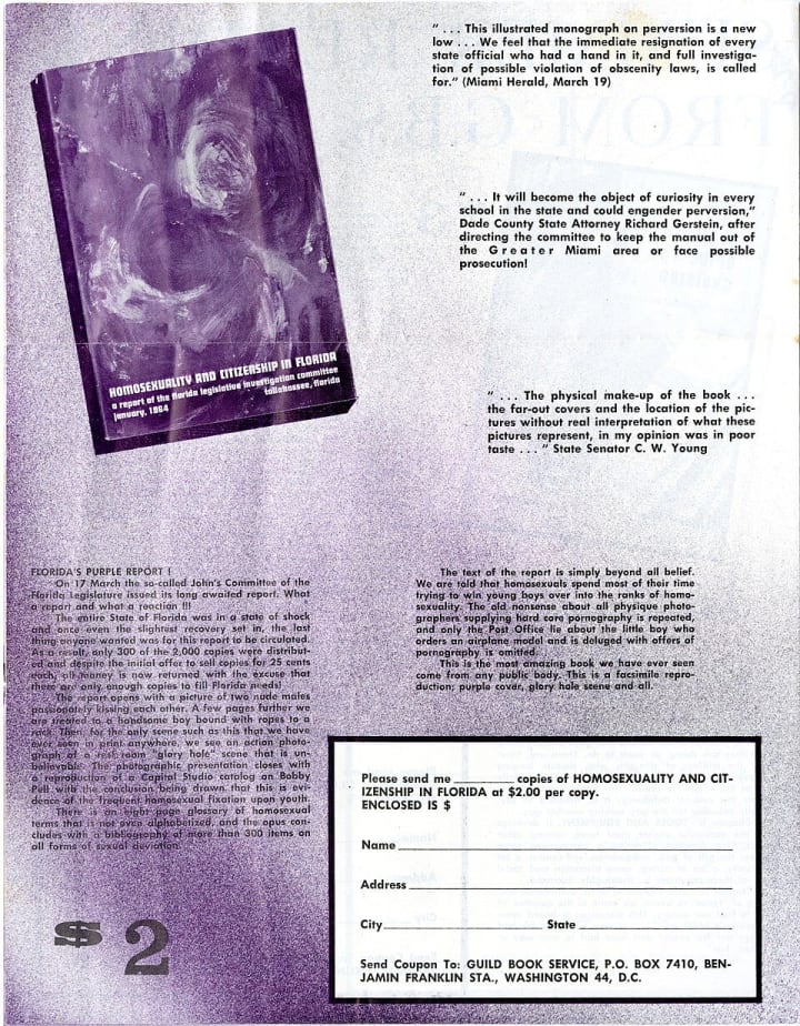In 1964, the Johns Committee published Homosexuality and Citizenship in Florida, instantly nicknamed The Purple Pamphlet for its violet cover. It was intended as a final, shocking justification for their crusade.