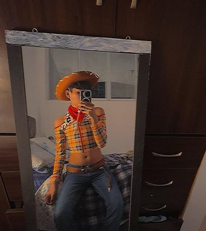 - Feminine clothing like skirts, thigh-highs, and crop tops.