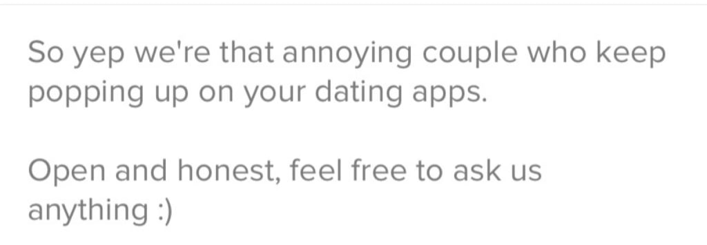 Even if you specifically state that you aren’t interested in couples, you WILL get messages from couples. I can always recognise a bisexual woman on a dating app before I even scroll to check her orientation, because just like me, she has the tell tale “NO COUPLES!!!!” in her profile, and just like me, I know that her wishes will be ignored and she will be bombarded by couples who don’t respect her enough to accept that she is not available to them.