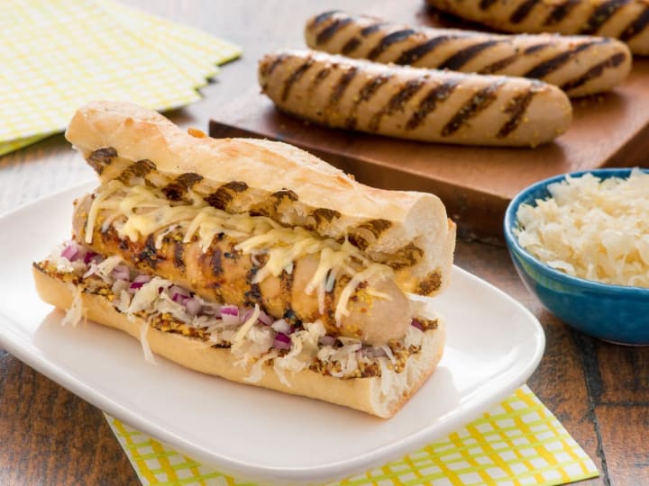 Simple ingredients include: six chicken sausages, three cups of beer, six cloves of garlic, one thinly sliced onion, and a tablespoon of canola oil. Poke six holes in each sausage, then poach them for four to five minutes until grilling for another six minutes on each side.