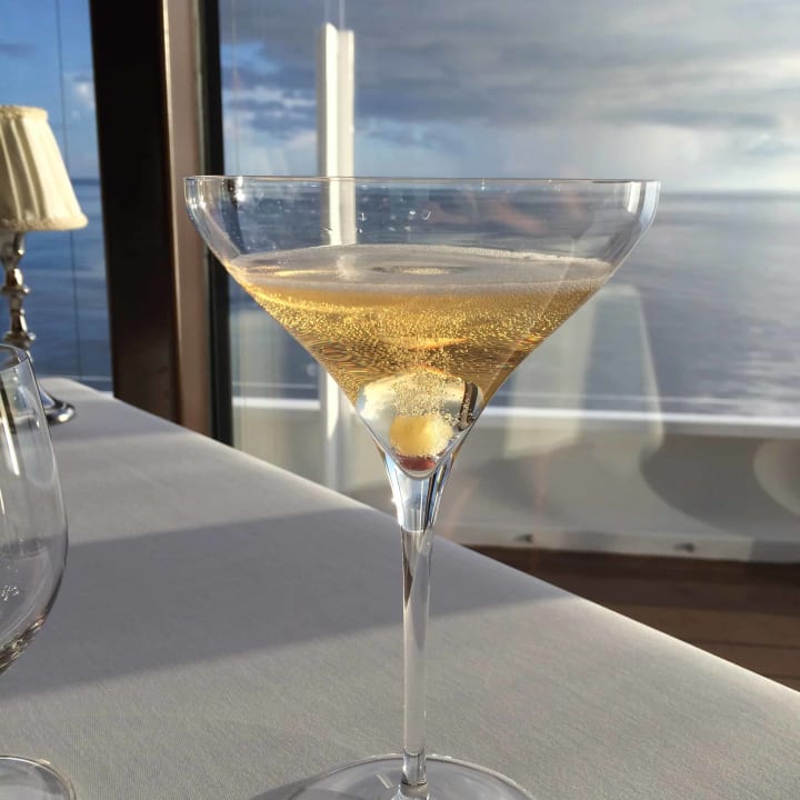 Champagne, vodka, Cassis pearls, dried pineapple cubes.