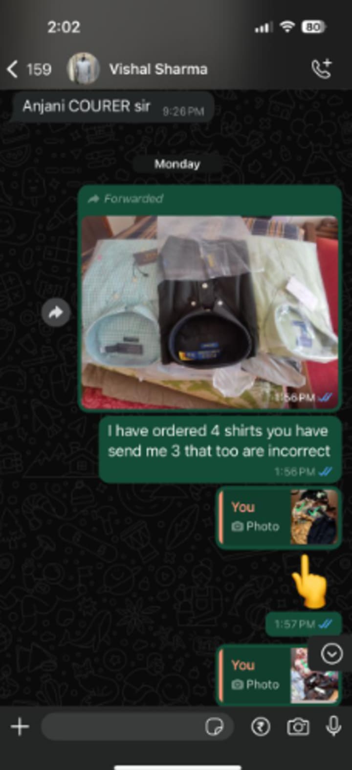 When the package finally arrived, it was shipped via Tirupati Courier - not Anjani Courier, as initially claimed. Upon opening the package, I discovered that none of the shirts matched my order. Instead, there were 3 entirely different and lower-quality shirts that I hadn't ordered.
