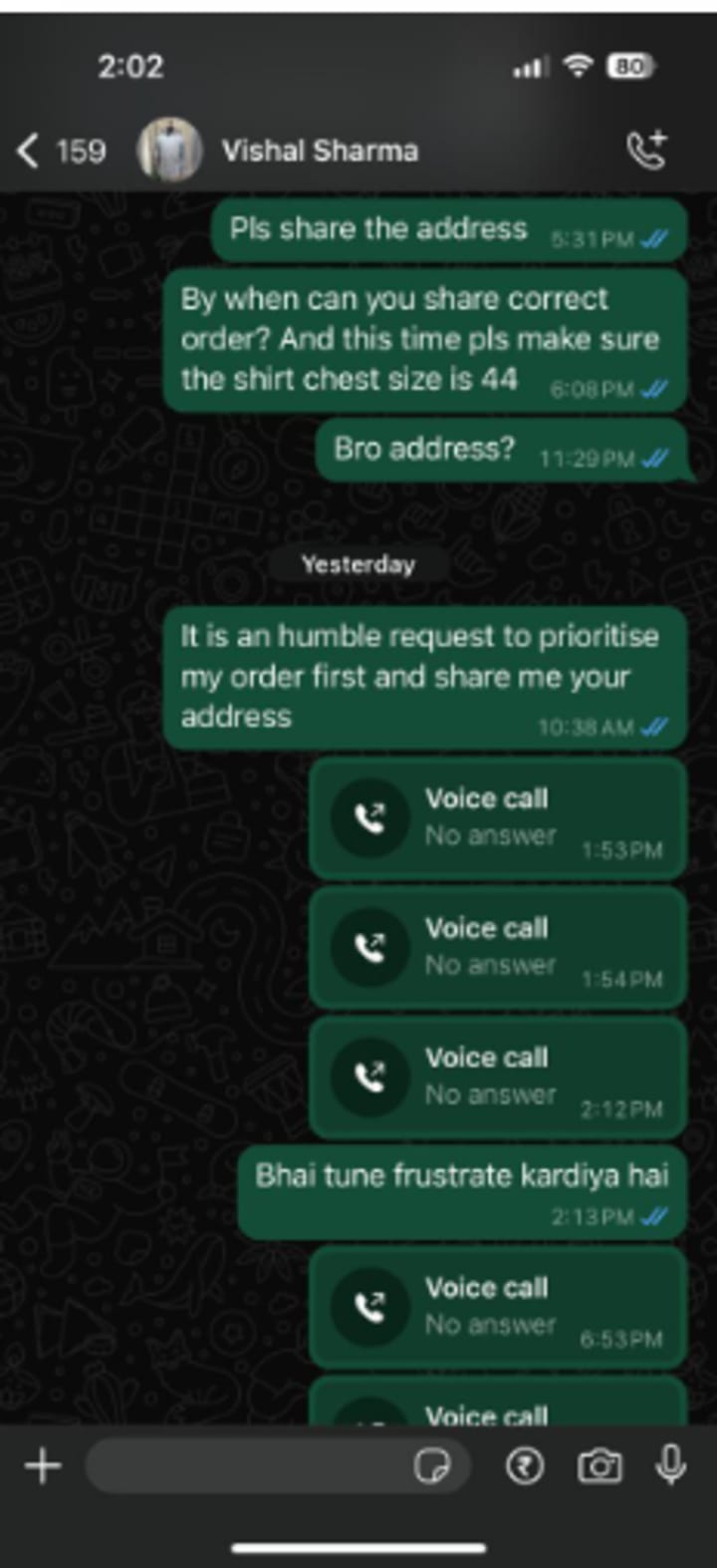 I immediately contacted Vishal Sharma to resolve the issue. He claimed that he had mistakenly shipped my order to Indore and promised to share his address for a return. However, since then, he has stopped answering my calls and has been unresponsive.