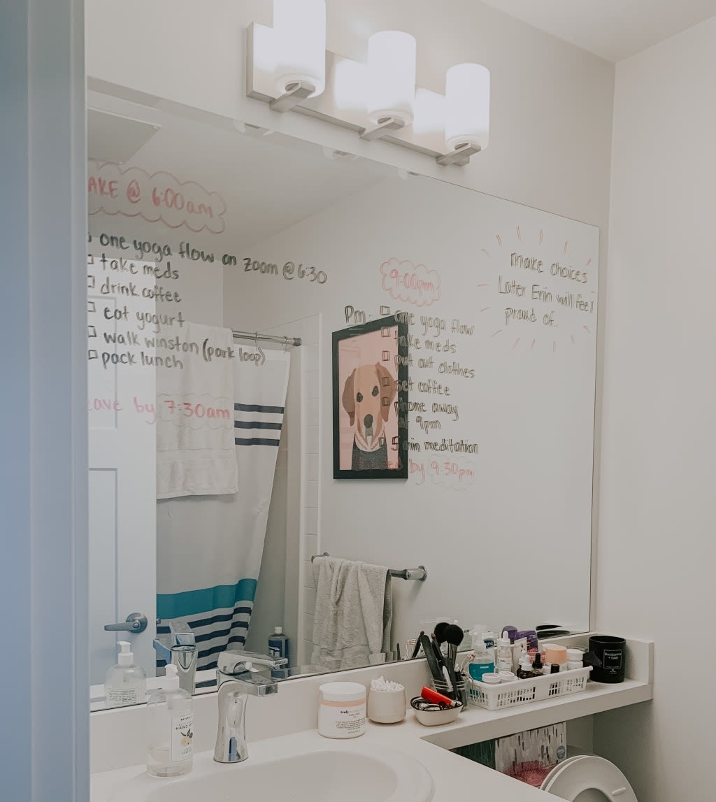 6. Object permanence is the ability to remember an object exists once it leaves our sight. Women with ADHD have a very hard time with object permanence; if we can't see it, it ceased to exist. This makes it incredibly hard for women with ADHD to tackle their other struggles, such as time blindness. To a neurotypical person, it might seem like the obvious solution for women with ADHD to use day planners and calendars to organize their lives. Sure, that would be great, if we could remember we bought that nice planner last week. Once we put it down, unless we leave it in a location that forces us to notice it, these organizational tools become useless dust-collectors. In my own life, I have probably purchased hundreds of planners in fruitless attempts to get myself organized. This year, I began writing on my mirror in dry erase marker, which seems to have helped me trick myself into noticing reminders. My bathroom mirror has a full schedule for each day, including basic tasks like stretching, setting out my clothes the night before, and taking my medication. Without these obvious visual cues, I would be completely lost in a cycle of wandering from room to room, unsure what it is I'm supposed to be doing each day.