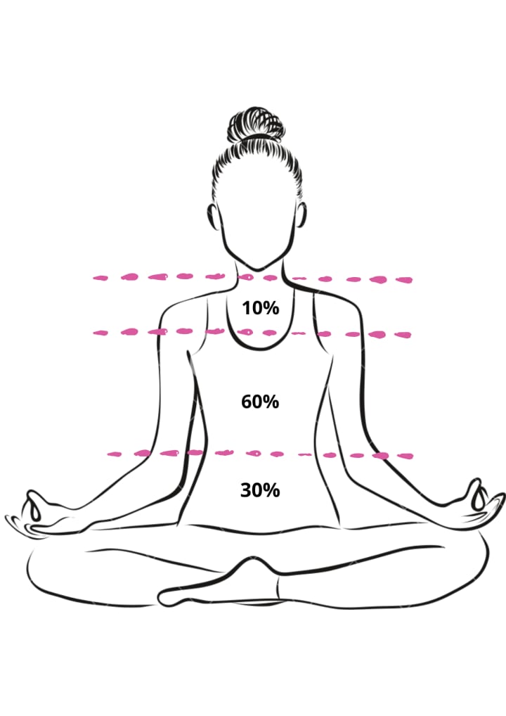 If a full breath could be split up into three parts, roughly 30% comes into the belly, 60% comes into the chest/lung region and 10% comes into the throat.