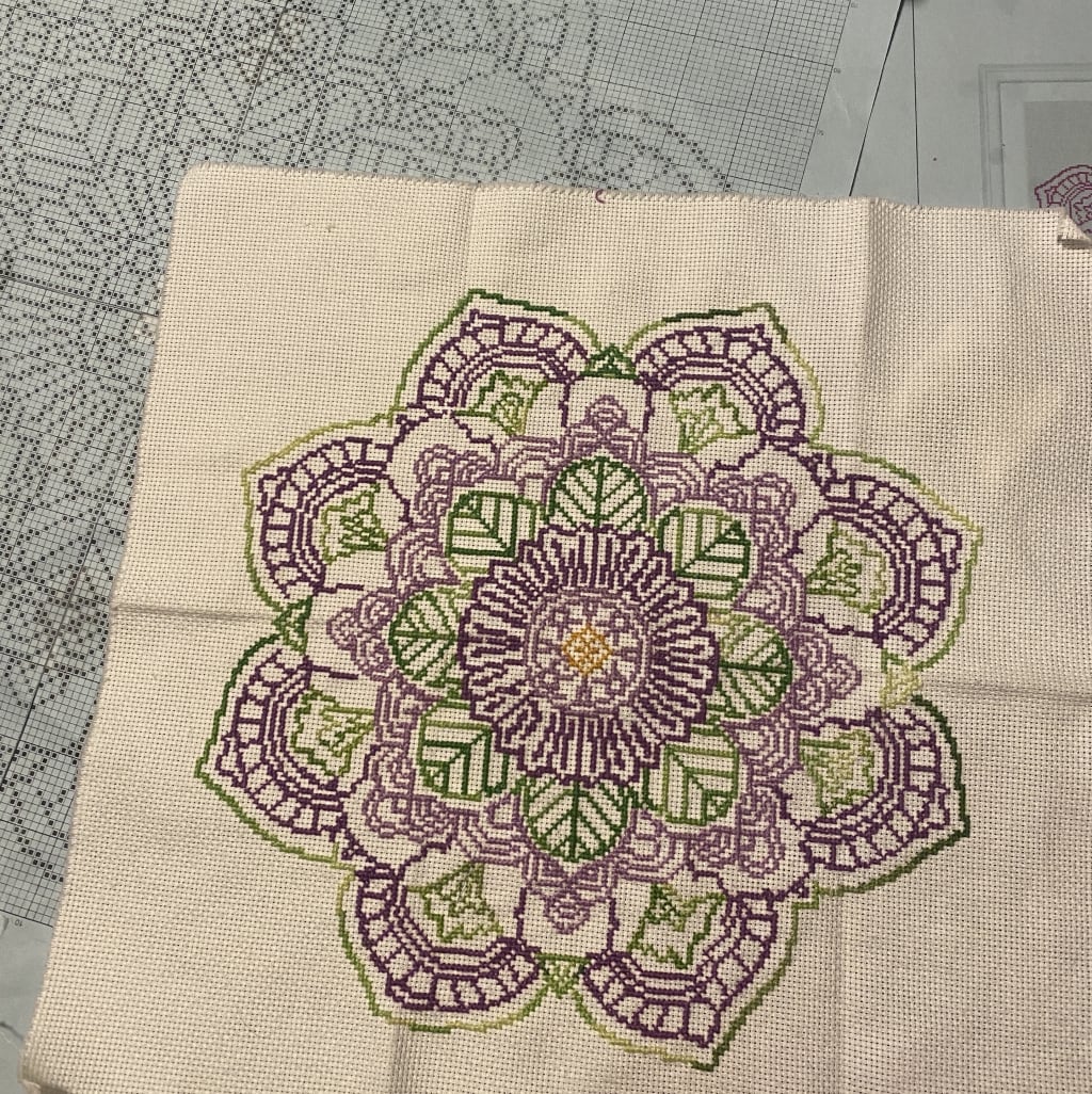The important thing in counted cross stitch is to follow the pattern carefully. Starting from the center and working out, any mistakes will be magnified as you move outwards. And oy, I kept embroidering while watching TV after dinner, and there are LOTS of mistakes.
