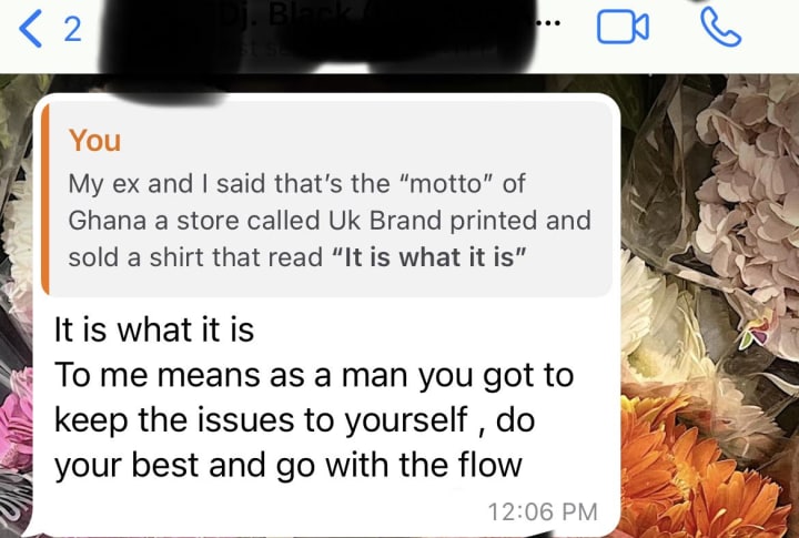 Here I decided to add a very recent screenshot from a conversation I was having with a Ghanian man. He used the popular term I've heard in Ghana more than I can count, "It is what it is!"
