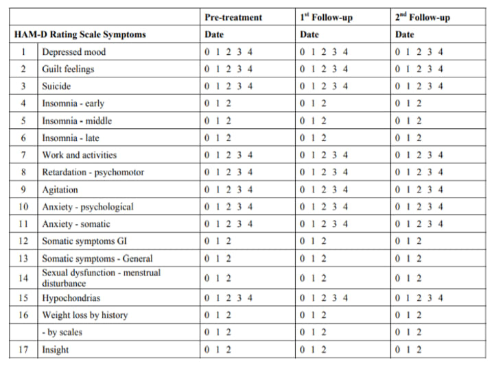 While the Hamilton 51 point rating scale has seen much criticism as a measure of outcome, it was in point of fact selected by the target pharmaceutical corporations, and any other information that would be of more significant relevance to recovery have seen compilation but have not seen any major publishing efforts.
