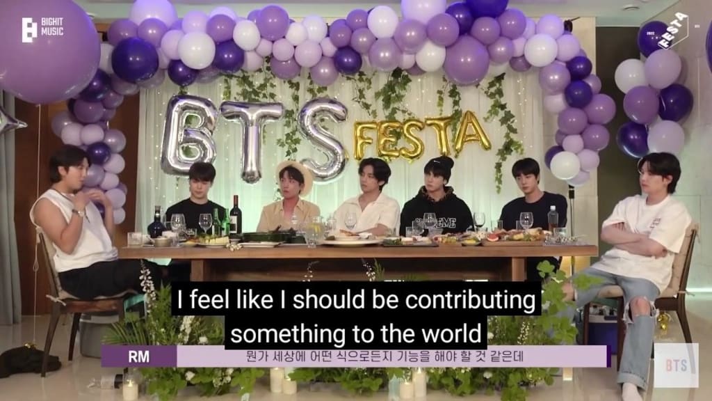 On June 14th BTS uploaded their yearly FESTA Dinner Party on YouTube in celebration of their 9th anniversary. In an stated to be unscripted video they are remiscening the growth and struggles they went through and how their relationship to their work and being part of the biggest south korean boy group has changed. They have been climbing up the ladder of success for the past nine years seemingly without a break. Each of them functioning in their own roles without much time to question the direction they are heading to and finding it increasingly difficult to internally find meaning in the work they are putting out.