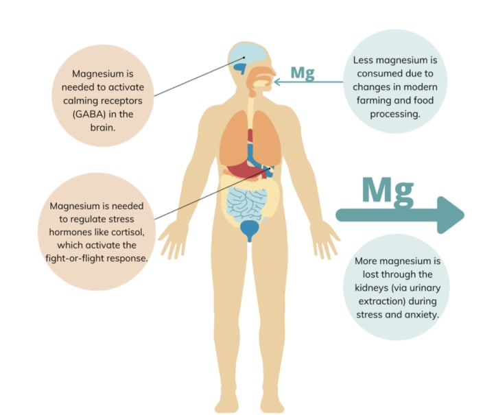 Did you know that a whopping 68% of people, which is basically most of us, aren't getting sufficient magnesium, as per the National Institutes of Health? Now, even if you're meeting your magnesium needs, stress and anxiety can drain your magnesium levels. Let me break it down for you. When you're under physical stress, like being sick or anxious, your sympathetic nervous system goes into overdrive. This leads to higher levels of cortisol and adrenaline, which, in turn, cause you to lose more magnesium through your urine. So, during stressful times, even folks with regular magnesium levels might experience a temporary magnesium shortage.