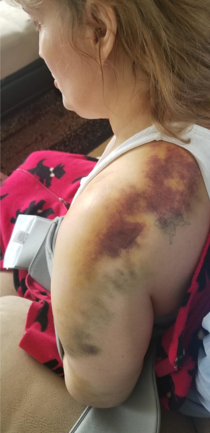 During the seizure thrashing-I not only dislocated my left shoulder but it was busted in two areas. Hence the photo. I broke the top of my back. I chipped two front teeth and if that wasn’t enough-I had suffered a brain bleed-which was caused either by an aneurism or a stroke. Also my blood wasn’t pumping properly to my arteries.