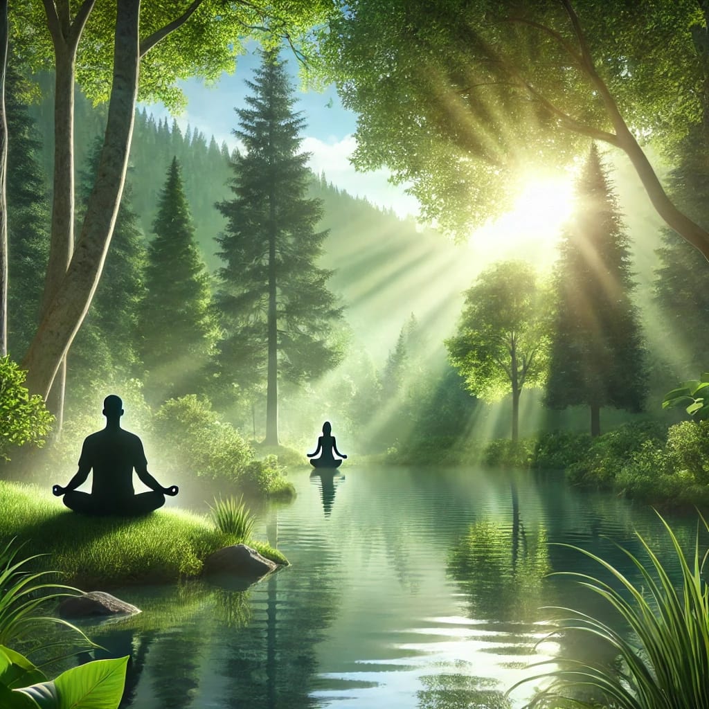 The serene natural environment and the meditating figure depicted in the image represent the inner calm that can be achieved through the consistent practice of mindfulness and stress management techniques, providing a powerful reminder of the mental peace that awaits when we make self-care a priority.