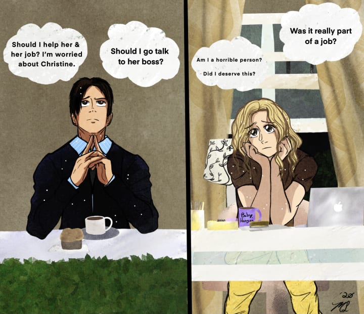 After that, Christine just got back to the office. She delivered Mr. Jack’s and Stu’s lunch. While Christine was making her coffee, Stu complained or accused Christine for ordering wrong. But, she didn’t and she was right! He didn't say or ask anything about the mayo on his sandwich. It upset her. He smirked at her that she’s not gonna get that position. It discouraged me about why all-male co-workers, directors, etc from the different industries always very controlling to all women and punishing their mistakes including sending the wrong food order or not cooking the meal right.