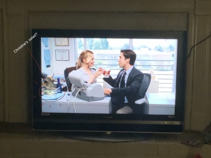 I can understand how Christine wanted to fit in better and be perfect in everything, especially to be a great girlfriend to Clay(Justin Long), a young professor from the psychology university. While being a perfect girlfriend, she gave him an old coin for his coin collection and fixed his printer without getting a new printer, etc. During the lunch scene, if I'm not mistaken, I see there's a salad besides Christine on the desk while Clay is having a sandwich on his side of the desk. I get confused about “she only uses water and coffee”? For my opinion, what about that salad?
