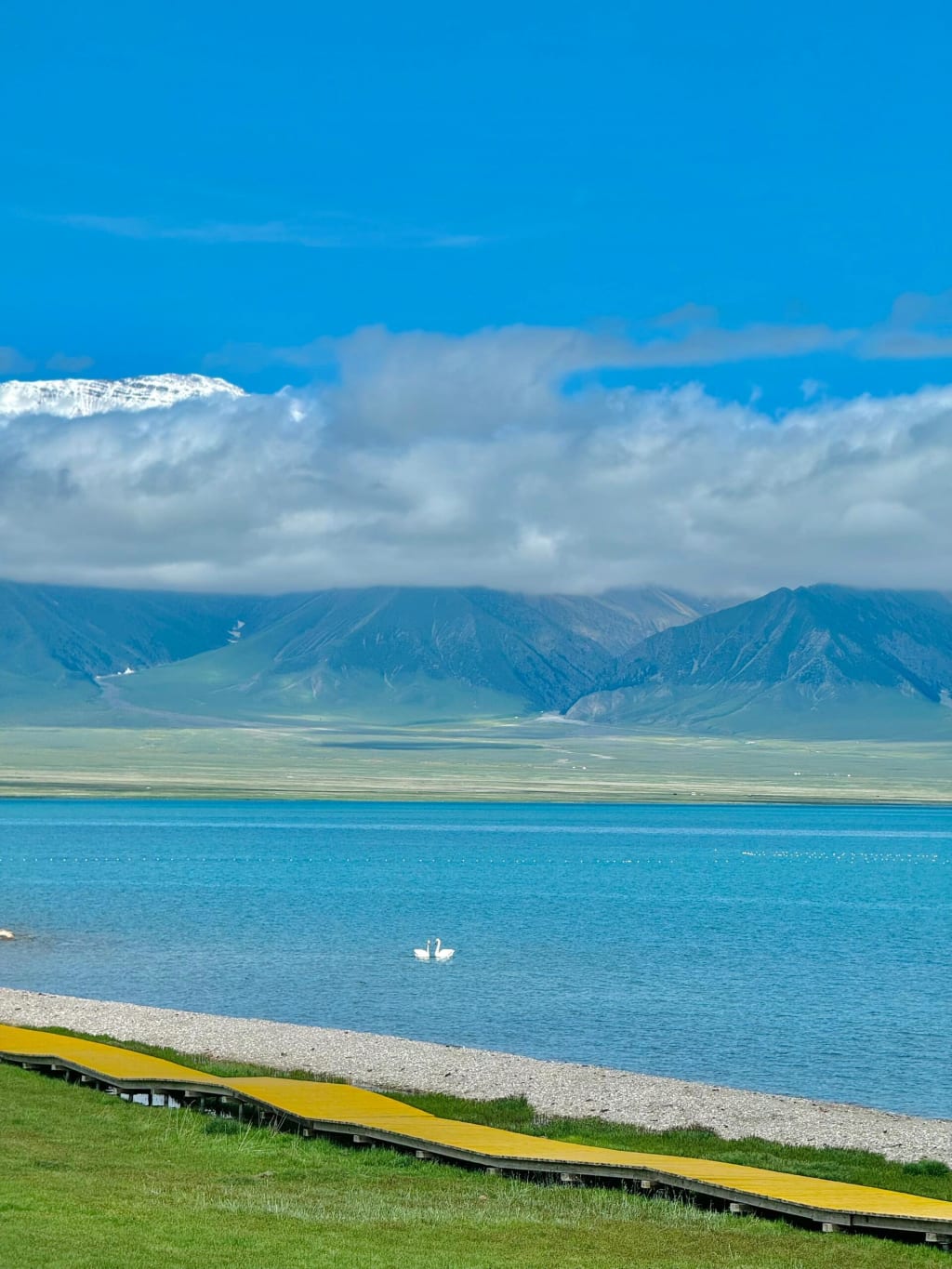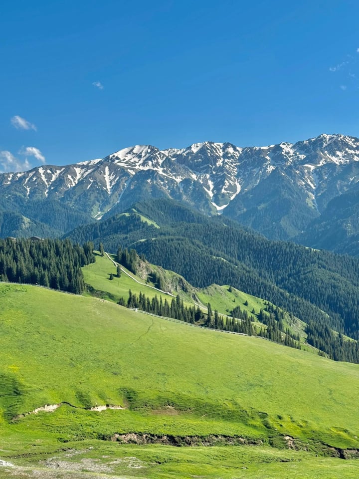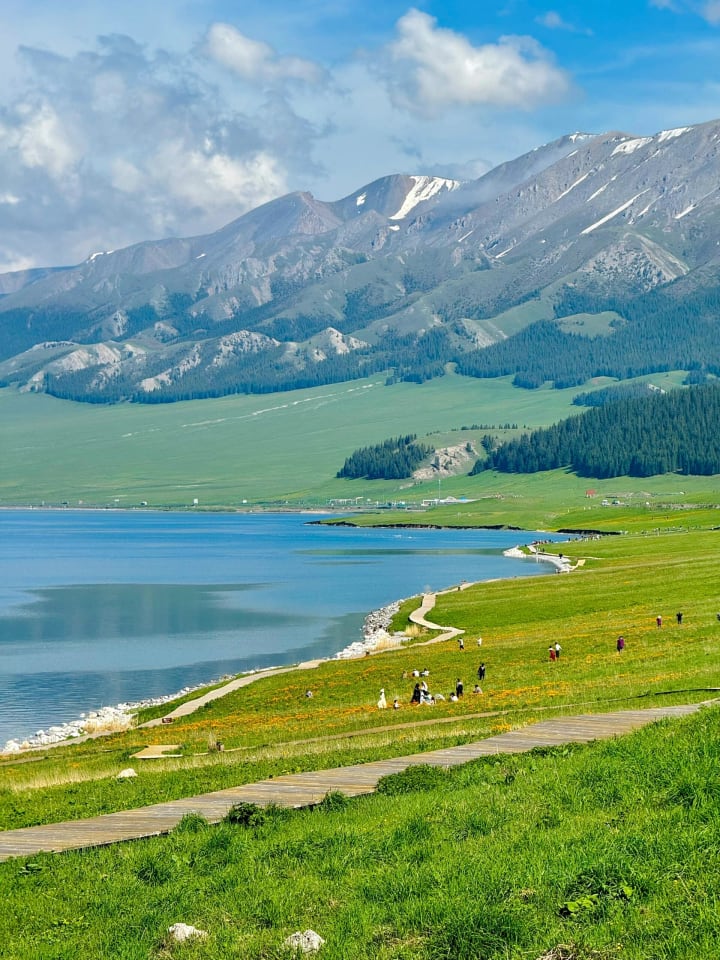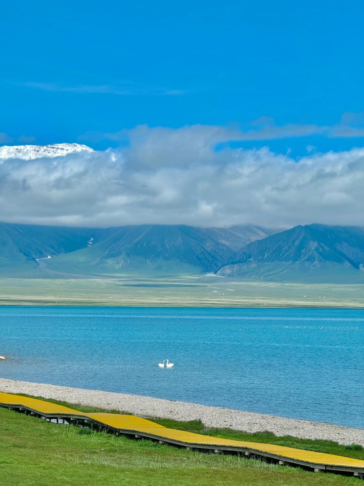 The moment I stood on the edge of Sayram Lake, I knew I had discovered a new shade of blue—the mesmerizing Saimu Lake blue. It's no wonder Sa Beining said that not visiting Sayram Lake is akin to living in vain. This place is a paradise on Earth, with its blue lake, snow-capped mountains, verdant meadows, fields of flowers, and graceful swans. Everything captured on camera feels surreal and breathtakingly beautiful!