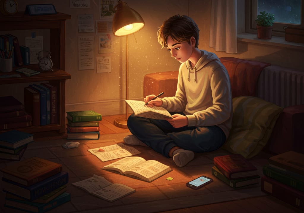 - A highlighted sentence or open tab showing where to continue.