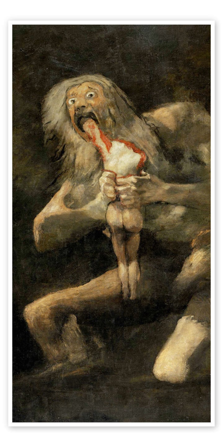 "Troll?! The painting is called SATURN and is a mirrored image of FEAR itself. Saturn, one of the Titans who once ruled the earth in Roman mythology, devours the infant he holds in his arm. According to a prophecy, Saturn was to be overthrown by one of his sons. In response, he ate his sons as soon as they were born. But the mother of his children, Rhea, hid one child, Zeus. In the image, Saturn is transformed into a monster through his fear, his eyes bulging, and his hands clutching his son’s battered body before taking another bite."