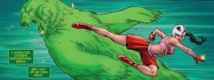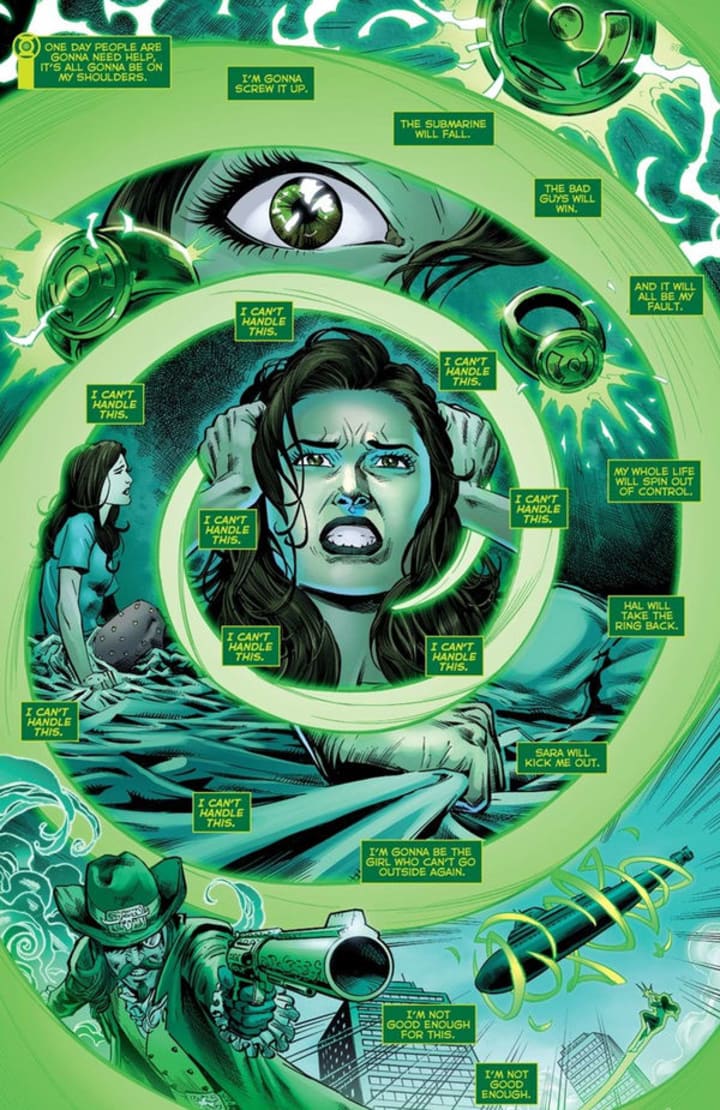 Now let me be clear: Jessica Cruz is indeed a true Green Lantern, and ironically, this issue shows why. You see, the Green Lanterns possess the power of Will. And every single day of Jessica Cruz's life, she must face her inner demons and triumph. Every day is a triumph of Will. There's not going to be a turning point for her; the anxiety is a part of her. Ironically, it is this very battle that proves — once and for all — that Jessica Cruz is worthy to be a Green Lantern.