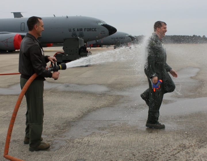 Though smaller than the US Army and Navy, the United States Air Force is not without its fair share of military tradition. In particular, fighter pilots in the Air Force have one of the most interesting military traditions, the hosing down of a pilot after his final flight. This stems from the classic football trope where players douse their coach in Gatorade after winning a championship game, but it is much more severe. After all, aircraft carriers aren't exactly fitted with weak garden hoses. These are heavy duty hoses, and these days the strong blast of water is complemented by food products like flour and mayonnaise.