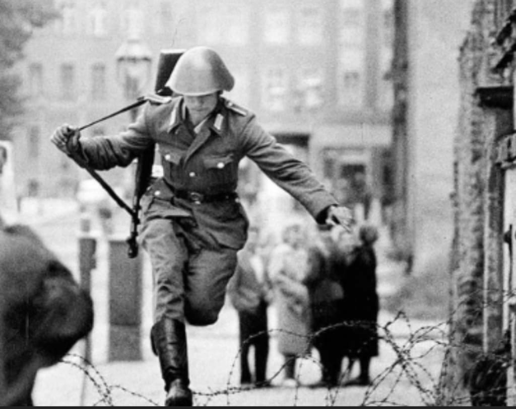 In one famous photo an East German Vopo in uniform, that is supposed to be guarding to prevent escapes, takes a running leap over the barbed wire coil and escapes himself.