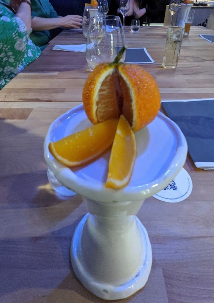 When a server reprimanded me for eating. These reconstituted orange slices (one per person) were a course. I asked if I could eat the real orange that had been served alongside it (we’d all gotten one, and I, at this point, was extremely hungry). “Yes,” the server said, annoyed. “But you aren’t really supposed to.” He let me have two segments and then whisked the fruit away.