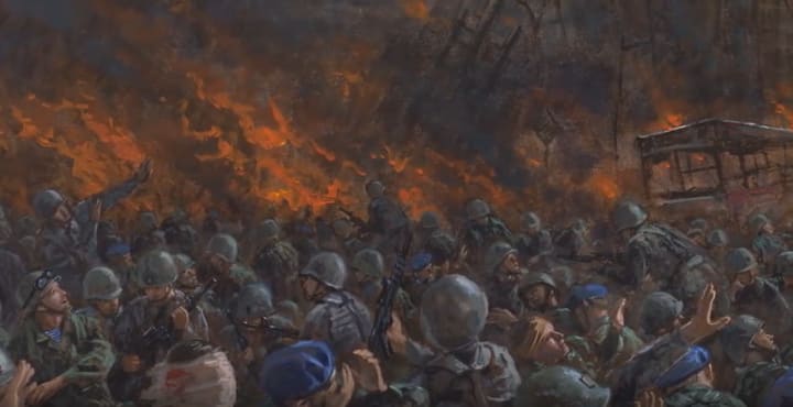 Washington looks on out towards the area where the woman is pointing. He sees what appears to be an army, traveling by land and by sea, invading into America. The army set fire and destroyed much of the land and attacked what appeared to be millions of people.