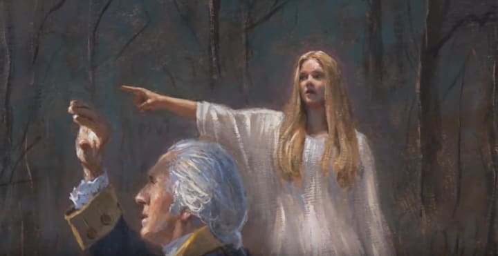 Washington states that he was sitting at his desk one evening, deciding battle tactics while listening to the crackling of the fire, he describes seeing a beautiful woman wearing a white robe, pointing off to a distance saying, "Son of the Republic, look on!"