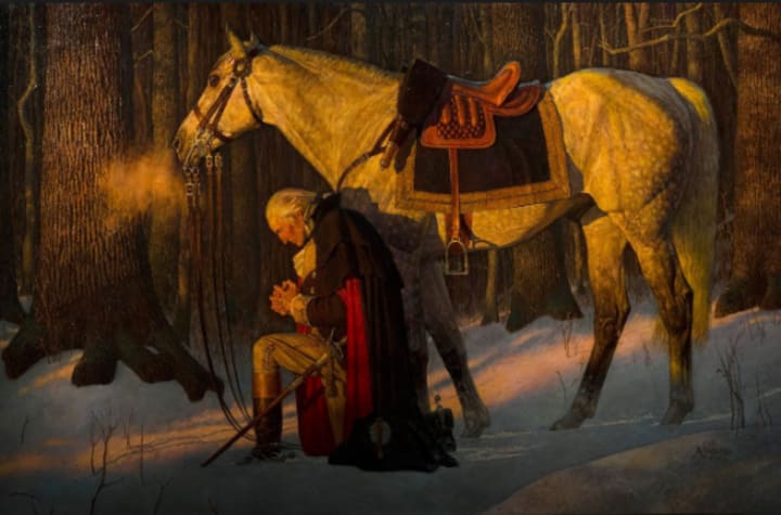 At the time of the Revolutionary War in 1777, George Washington and his continental army were stationed at Valley Forge during a long and brutal winter. Many of the soldiers were sick and dying of hypothermia, starvation, or disease. Washington's commanders questioned whether or not they should surrender to the British due to the fact that they were practically dying out in this camp. Washington felt the weight of the war over top of him and went outside into the woods to pray.